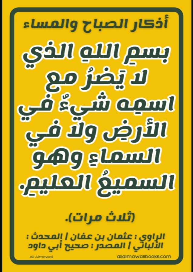 مَن قال: بسمِ اللهِ الذي لا يَضرُ مع اسمِه شيءٌ في الأرضِ ولا في السماءِ وهو السميعُ العليمِ . ثلاثُ مراتٍ ، لم تصبْه فجأةُ بلاءٍ حتى يُصبحَ ، ومَن قالها حينَ يُصبحُ ثلاثَ مراتٍ لم تُصبْه فجأةُ بلاءٍ حتى يُمسي.