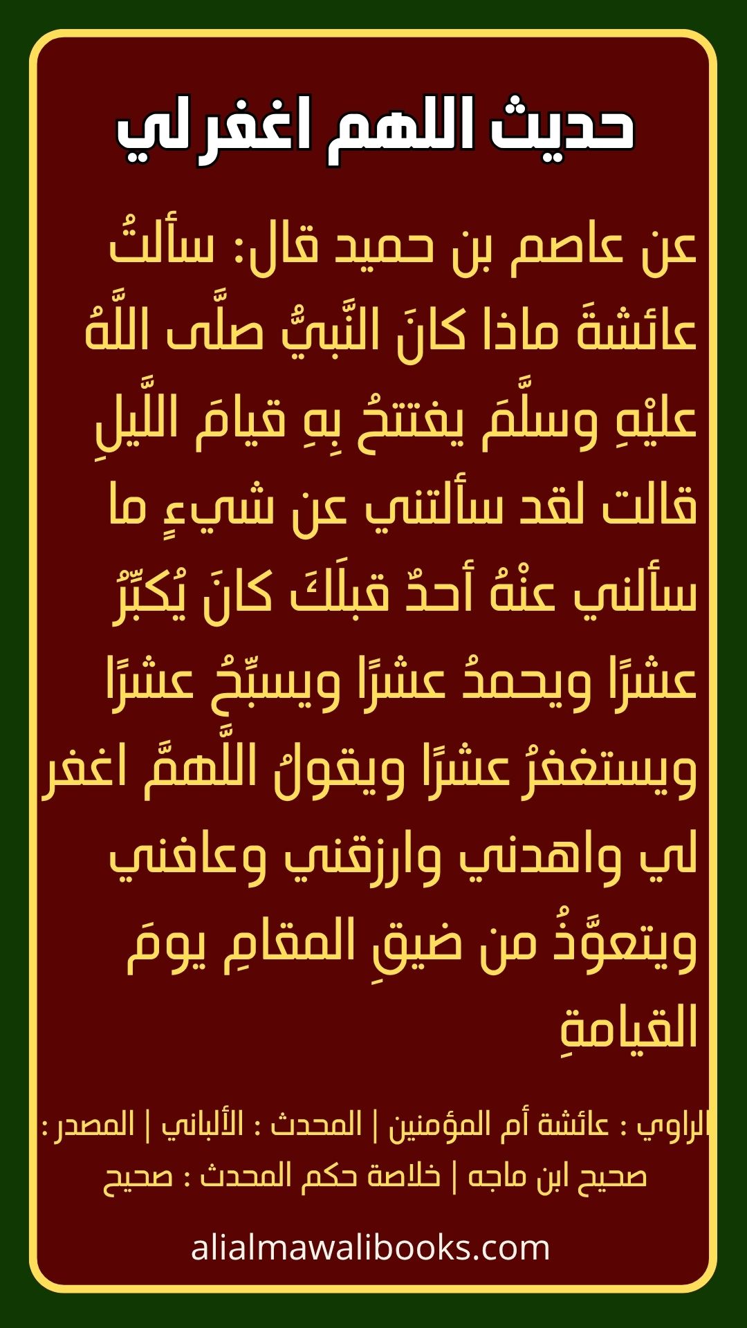 عن عاصم بن حميد قال: سألتُ عائشةَ ماذا كانَ النَّبيُّ صلَّى اللَّهُ عليْهِ وسلَّمَ يفتتحُ بِهِ قيامَ اللَّيلِ قالت لقد سألتني عن شيءٍ ما سألني عنْهُ أحدٌ قبلَكَ كانَ يُكبِّرُ عشرًا ويحمدُ عشرًا ويسبِّحُ عشرًا ويستغفرُ عشرًا ويقولُ اللَّهمَّ اغفر لي واهدني وارزقني وعافني ويتعوَّذُ من ضيقِ المقامِ يومَ القيامةِ