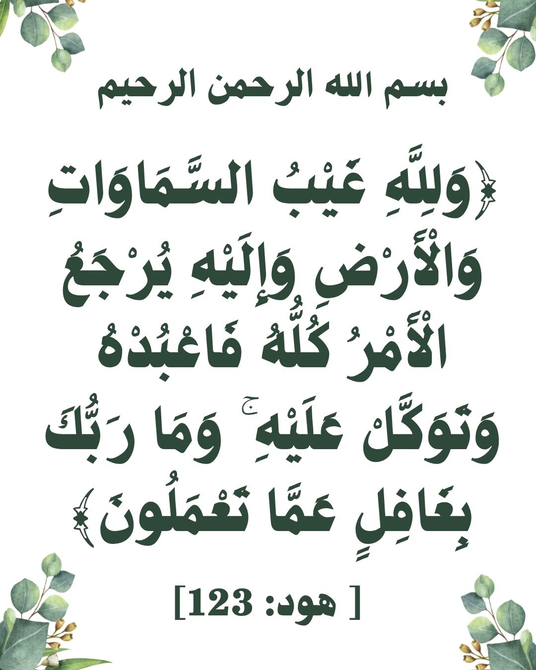 ﴿ وَلِلَّهِ غَيْبُ السَّمَاوَاتِ وَالْأَرْضِ وَإِلَيْهِ يُرْجَعُ الْأَمْرُ كُلُّهُ فَاعْبُدْهُ وَتَوَكَّلْ عَلَيْهِ ۚ وَمَا رَبُّكَ بِغَافِلٍ عَمَّا تَعْمَلُونَ﴾