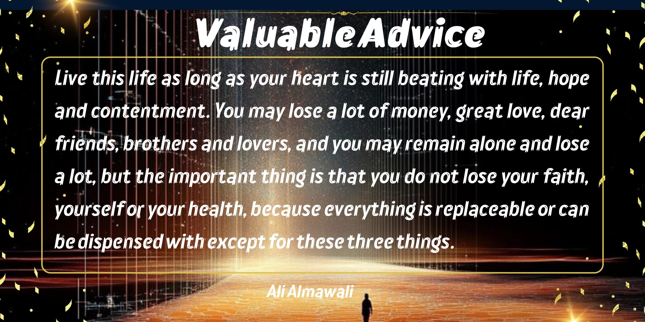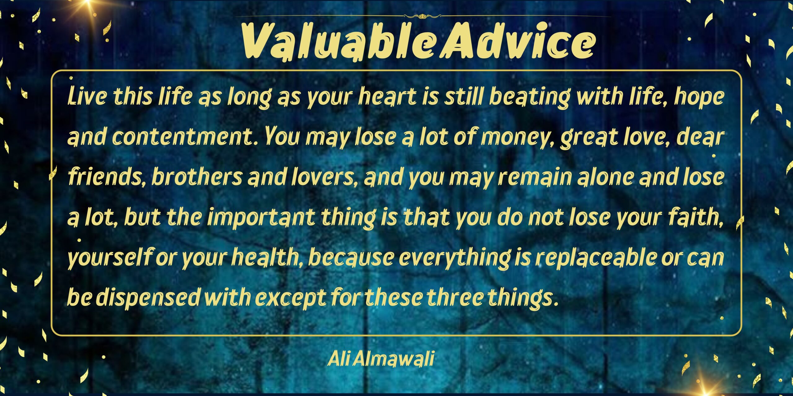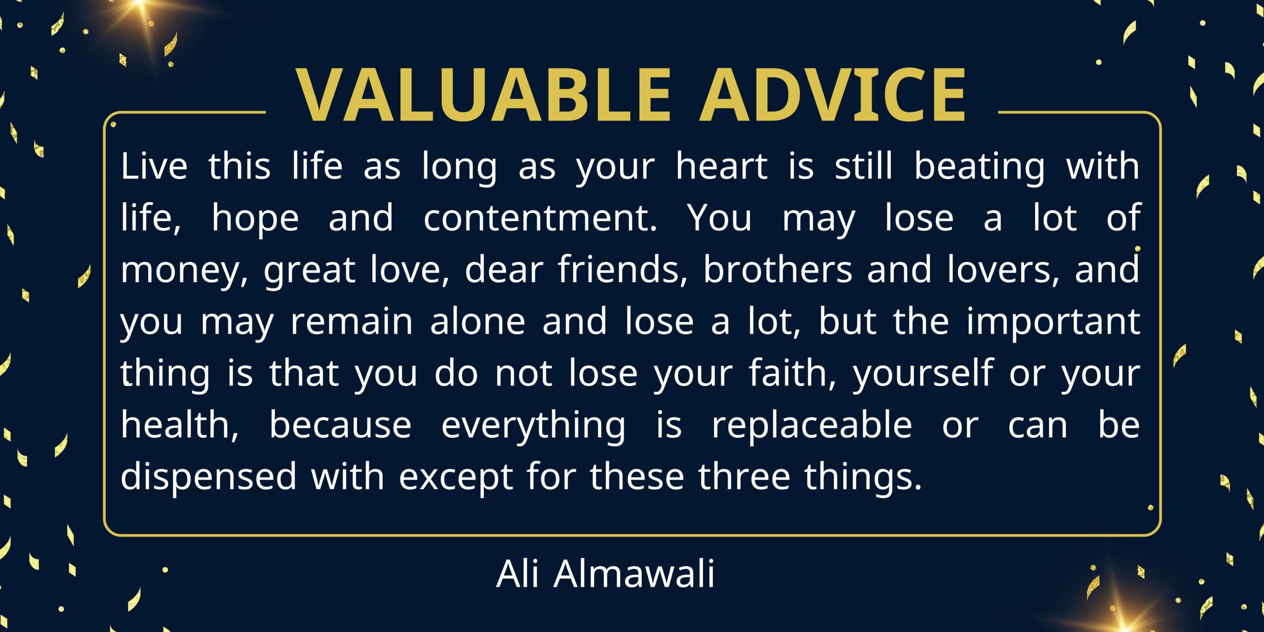 Live this life as long as your heart is still beating with life, hope and contentment. You may lose a lot of money, great love, dear friends, brothers and lovers, and you may remain alone and lose a lot, but the important thing is that you do not lose your faith, yourself or your health, because everything is replaceable or can be dispensed with except for these three things.
